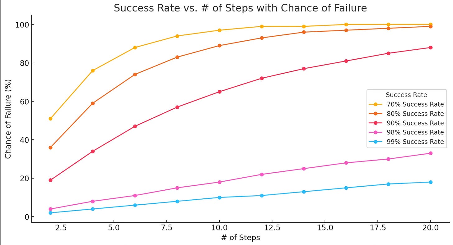 As you can see, the more steps an agent takes without human intervention the risk of failure creeps up quickly. Even if you think you have you agent dialed in an average 99% success rate, at 20 steps 1 in 5 times it will have made at least 1 mistake.